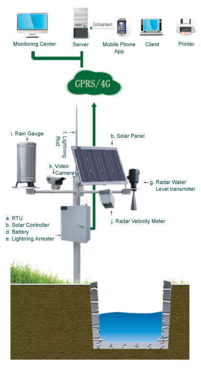 The system can acquire real-time signals from water level, flowing velocity, rainfall and video via remote terminal equipment. Via wireless GPRS or 4G wireless communication network, the acquired data are transferred to a master station where they will be received, stored, analyzed and processed to be created various data sheets, reports and charts. End users can query data from monitoring stations via their PC or mobile to realize unattended remote monitoring of water level monitoring station, or meteorological research station, etc.